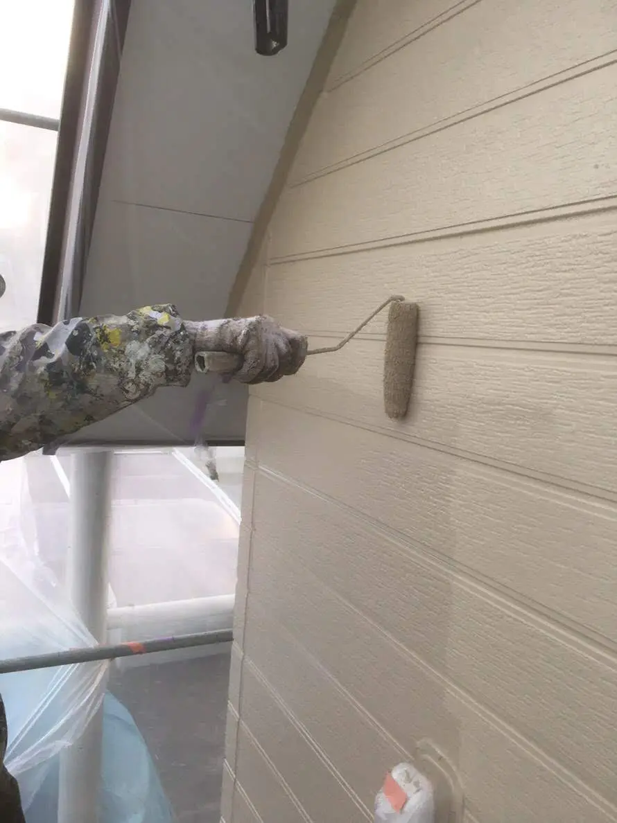 千葉市にて外壁塗装の上塗り作業を行いました。下塗り、中塗りを終えて十分に乾かしたので、この上塗り作業が最後の塗装になります。