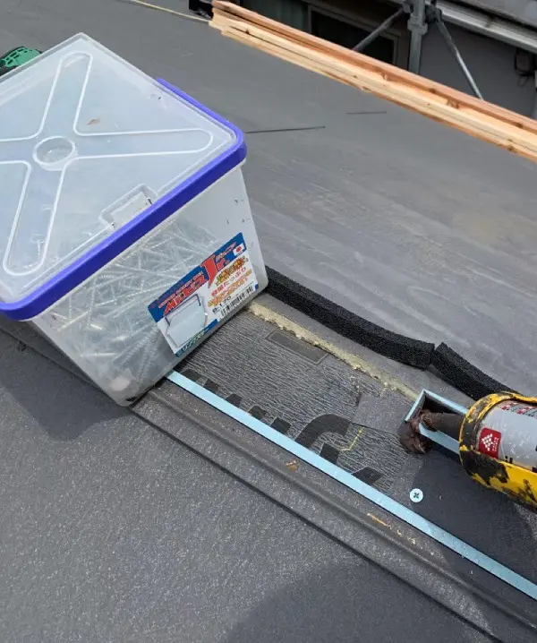 こちらは棟板金の下地にコーキングを充填している写真です。