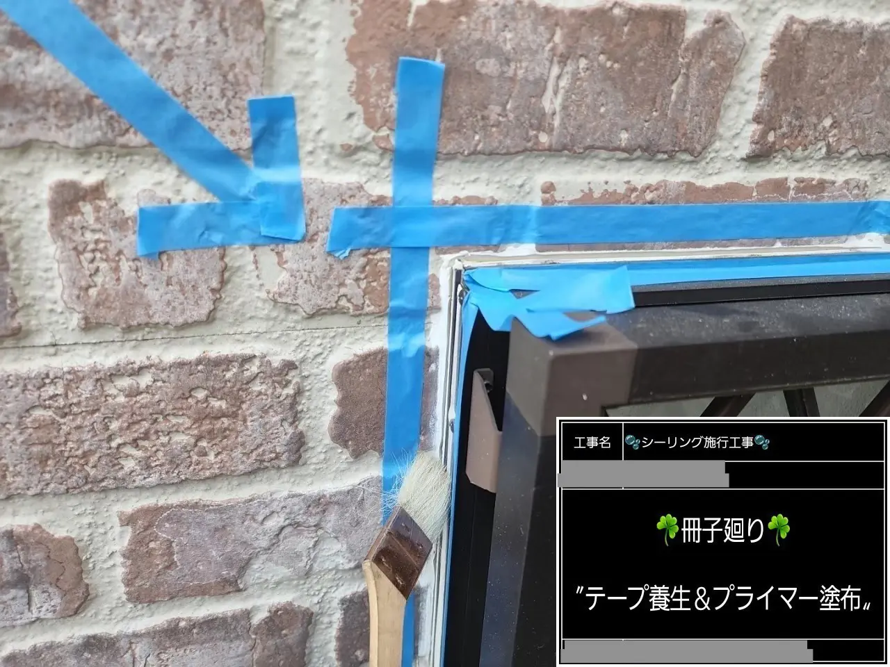 冊子周りにシーリング材を充填する前に、養生テープをはり、プライマー塗料を塗布していきます。