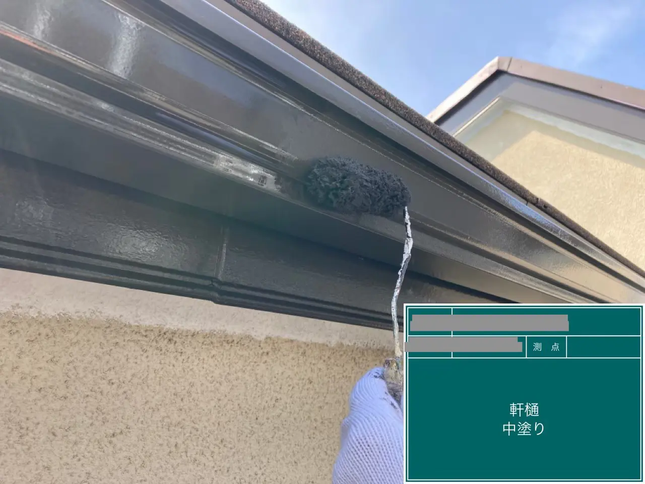 下塗りの塗料の乾燥を終えたら、軒樋に中塗りを行っていきます。