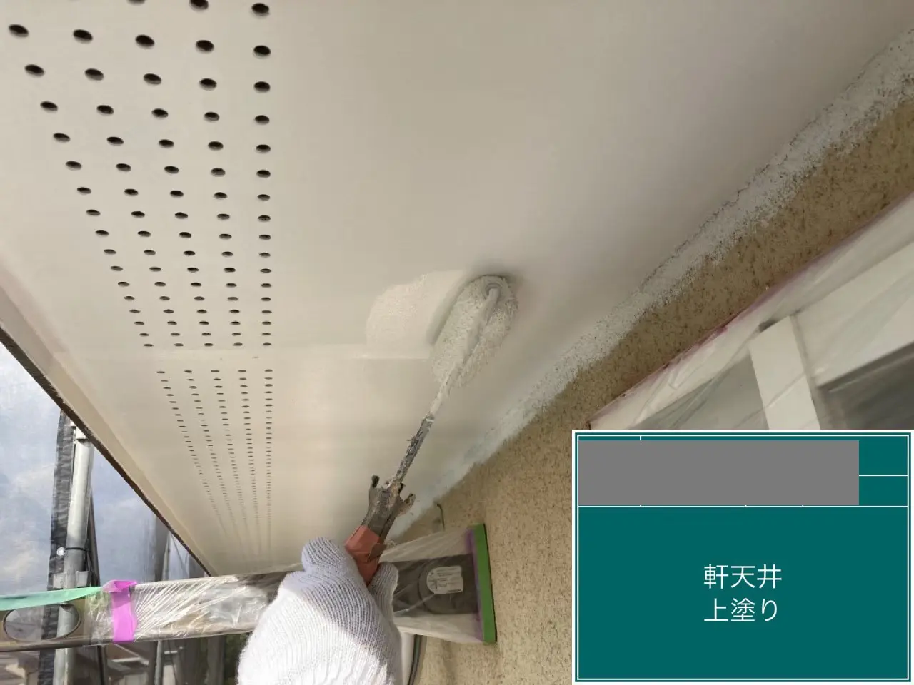 今回ご紹介させていただくのは、O様邸の軒天井の塗装作業の様子です。