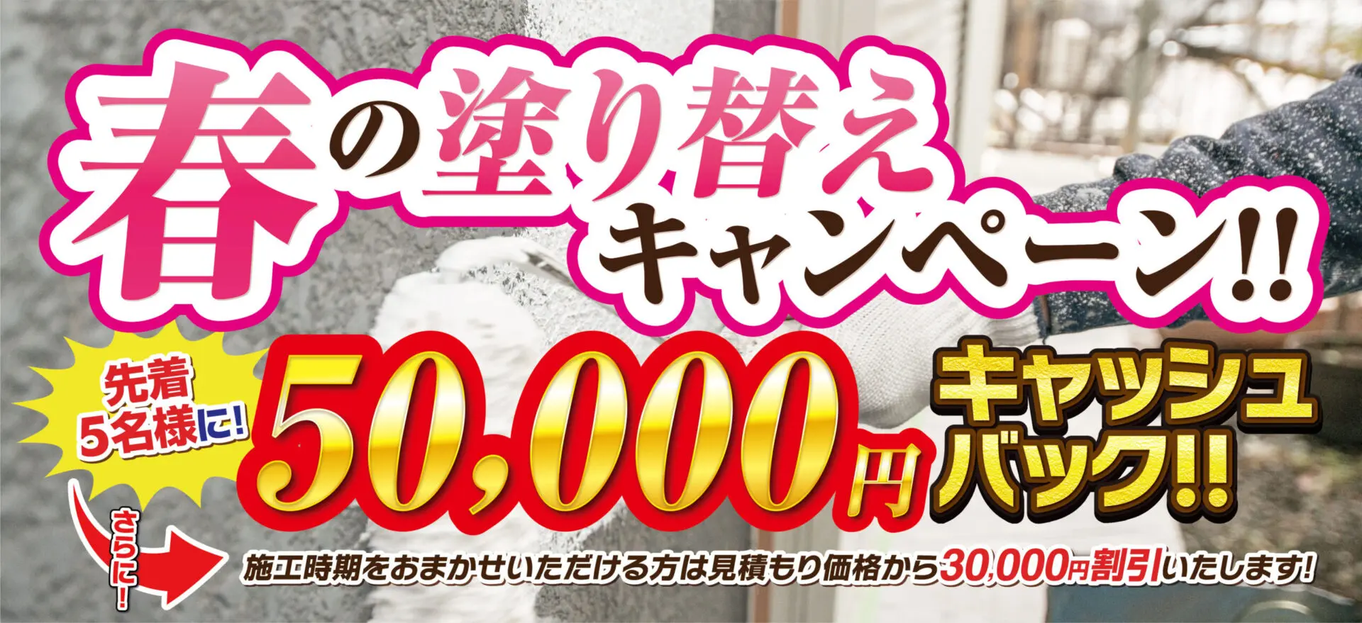 春の塗り替えキャンペーン!!先着5名様に50,000円キャッシュバックいたします。