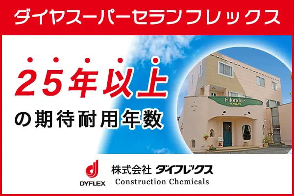 柔らかいシーリングの上に塗られた塗膜は下地の動きによりひび割れが発生しやすい状況にあります。 ダイヤスーパーセランフレックスはダイヤスーパーダンセイ(JIS A 6021 建築用塗膜防水 材)の上塗材として適用できるほど、柔軟性に優れた塗膜が特長です。